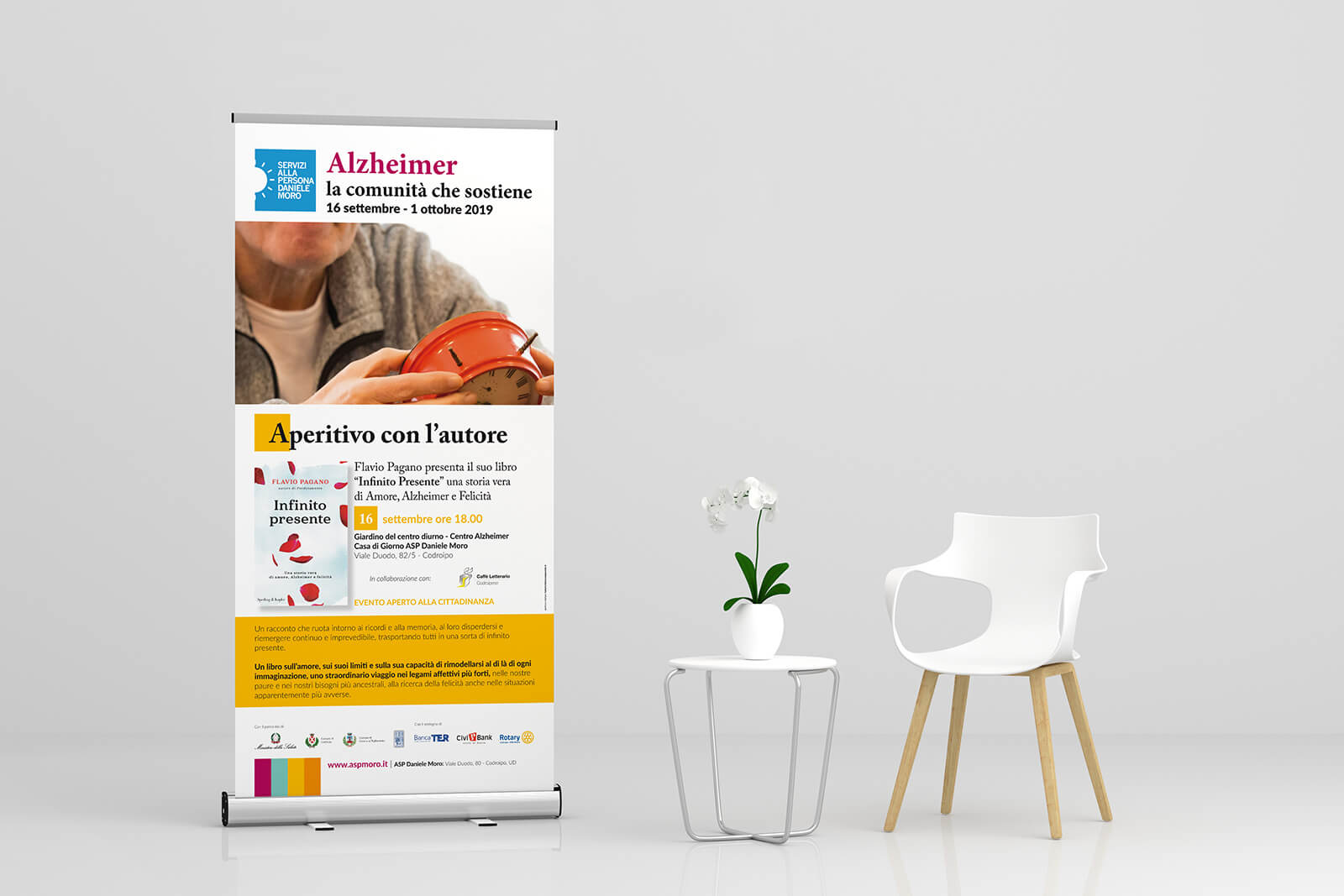 Realizzazione del materiale promozionale per la rassegna sull'Alzheimer. Brochure, manifesti, pieghevoli e roll-up.