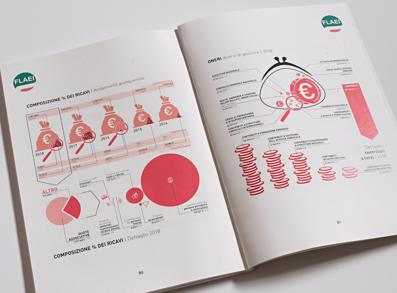 Il bilancio di missione CISL FLAEI è stato progettato dallo studio di grafica e pubblicità di Futura FACTORY. Sono state scelte le infografiche come strumento per comunicare meglio. Un esempio di professionalità e sostenibilità.