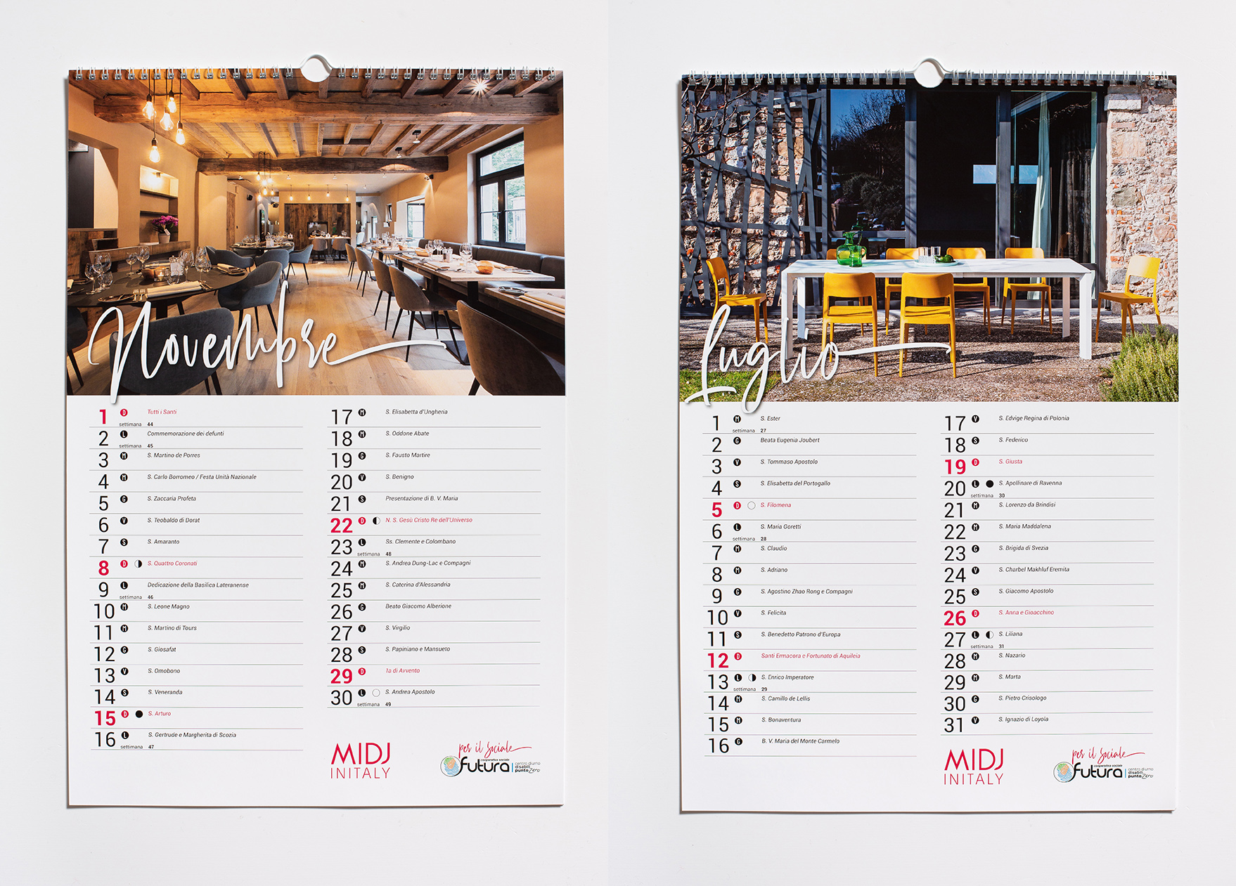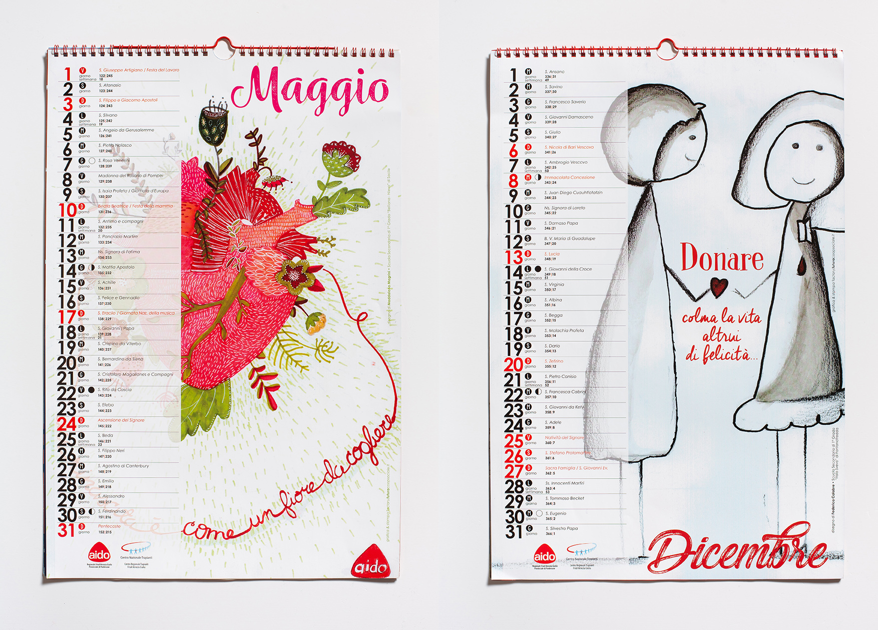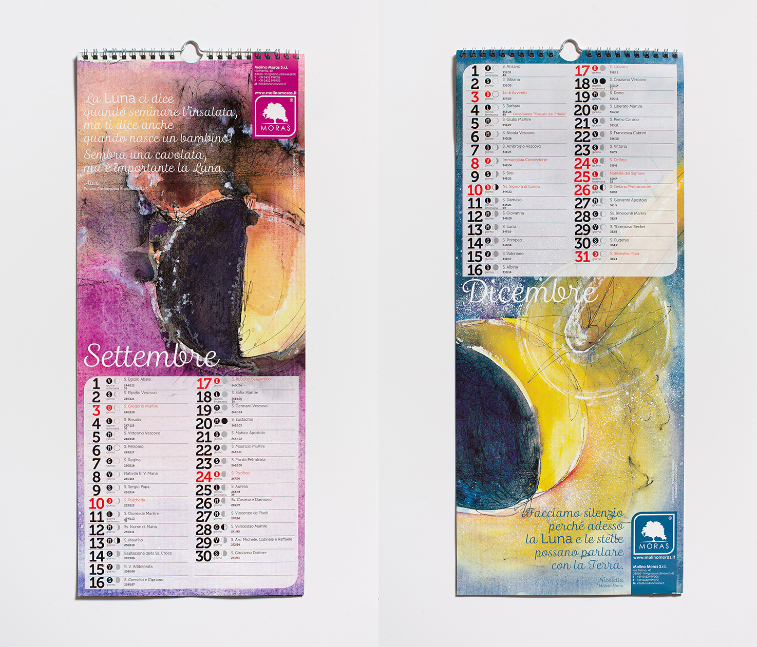 Progettazione grafica anche con illustrazioni personalizzate, stampa e confezionamento con spirale o punto metallico di calendari da parete o da tavolo.
