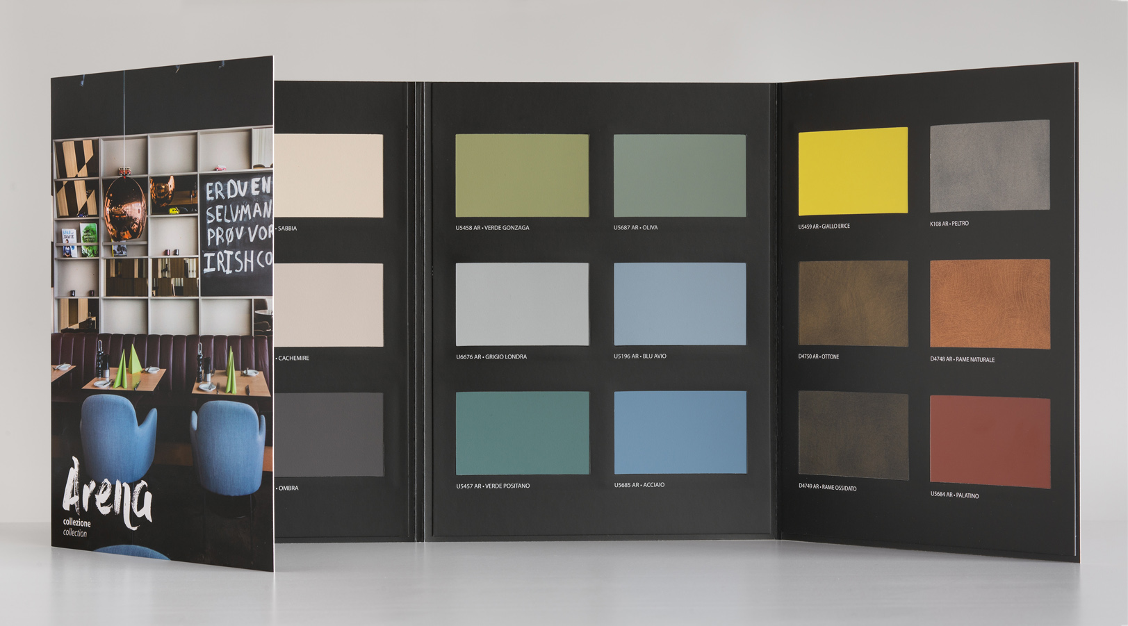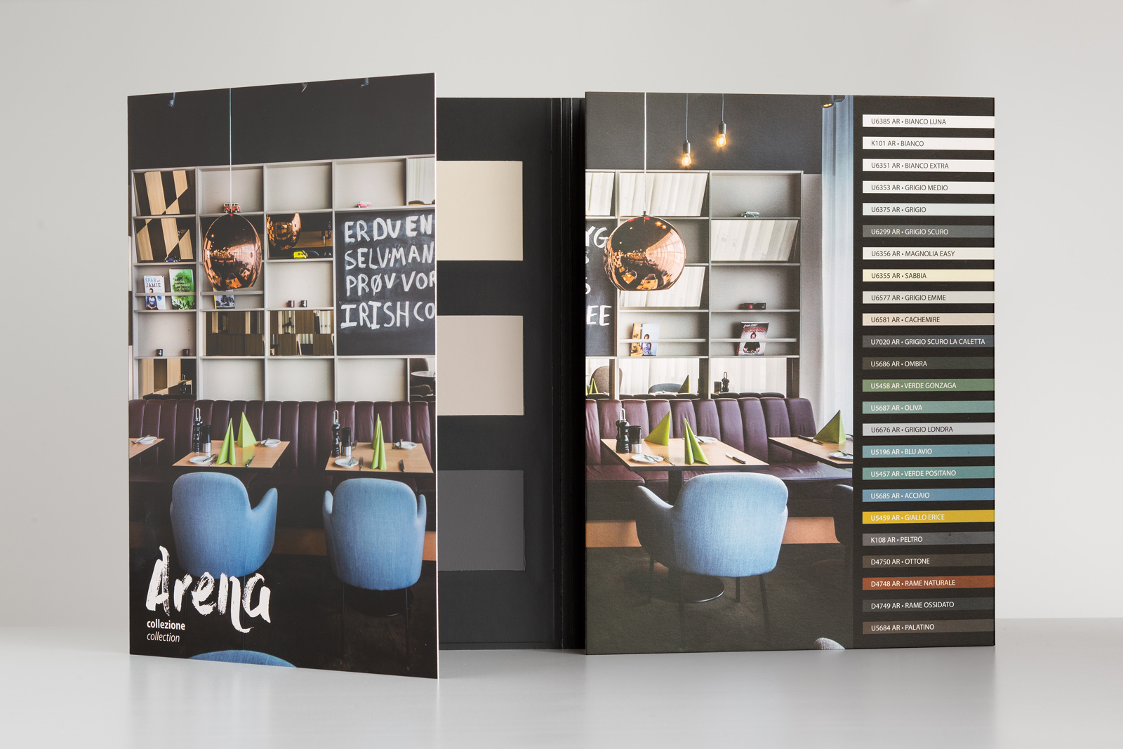 Campionario delle finiture disponibili per l'Italia di una delle più grandi aziende produttrici di laminato plastico. Le tessere di laminato sono incorniciate da una maschera, che ne nasconde lo spessore e rende più gradevole la consultazione.