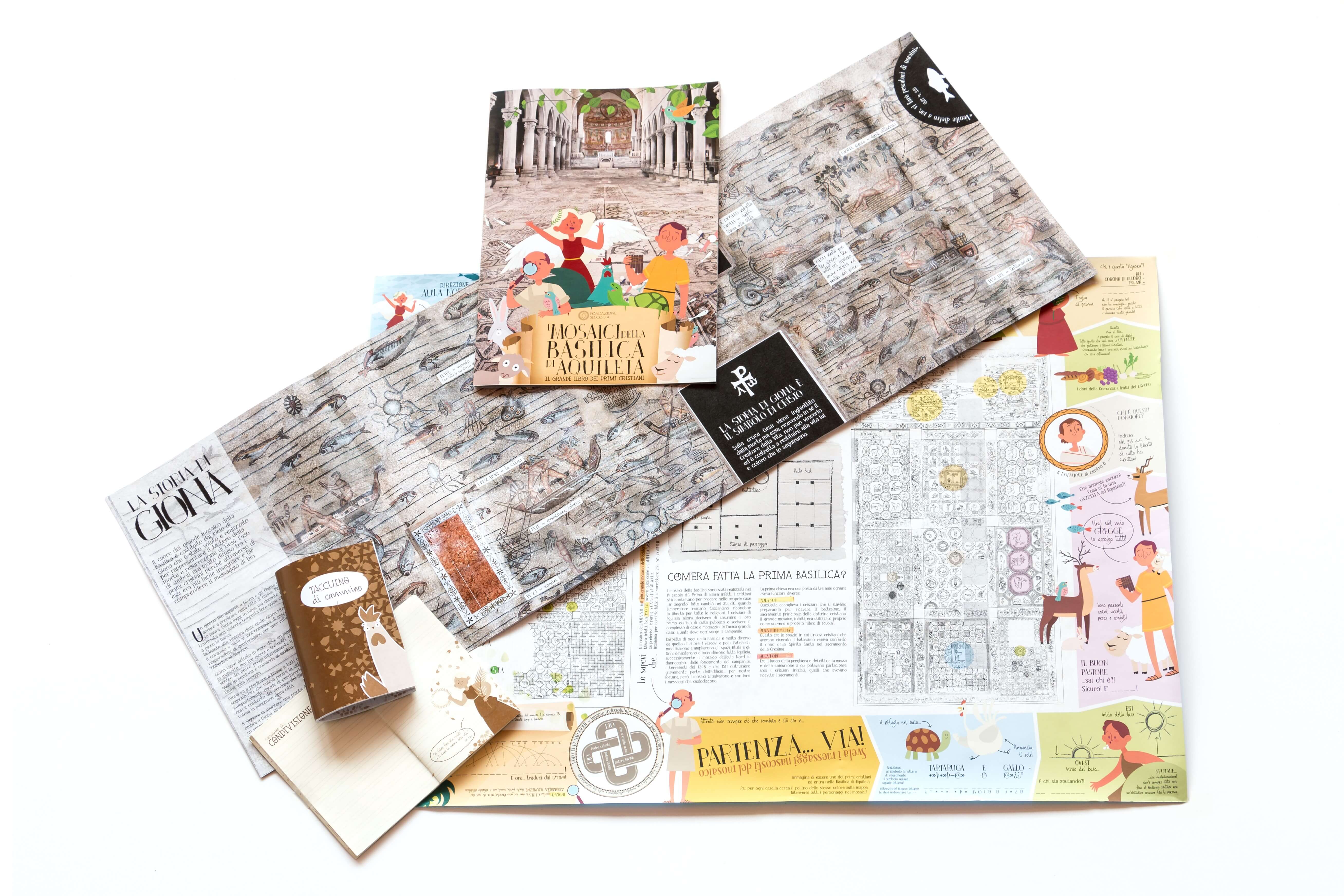 Kit informativo sulla basilica di Aquileia e i suoi mosaici, rivolto ai ragazzi in visita e non. Composto da un fascicolo, una mappa di grande formato e un taccuino per gli appunti, rivela in maniera accattivante e coinvolgente i significati nascosti del patrimonio musivo della basilica.